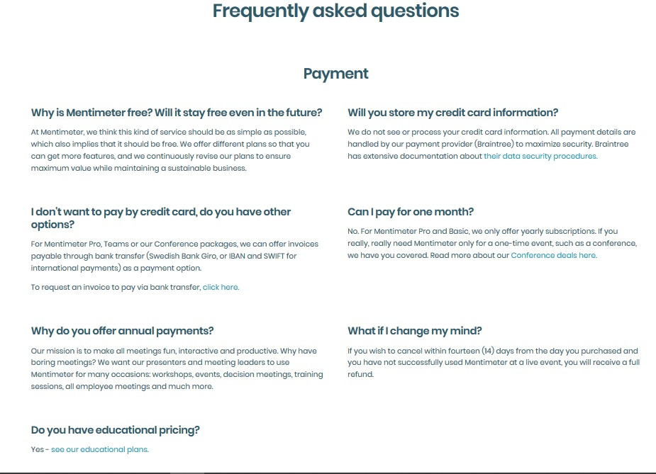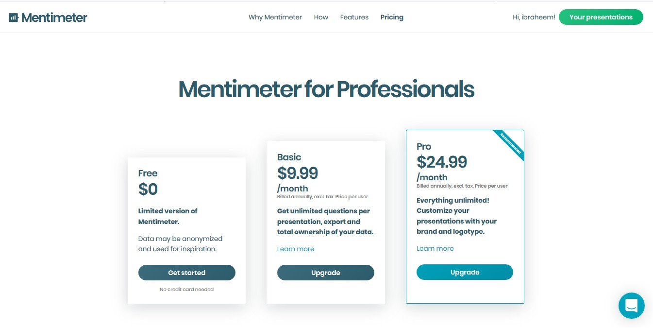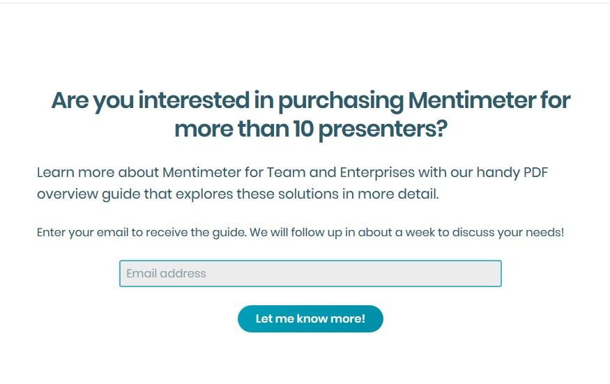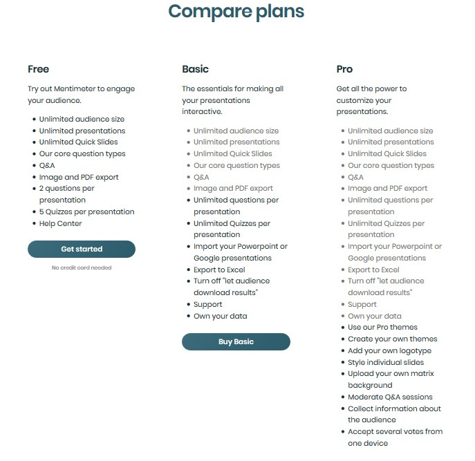 bahagian ini menunjukkan apa yang di tawarkan. Terdapat 3 tawaran yang disediakan iaitu free, basic dan pro. Jika anda mempunyai syarikat dan mendapati mentimeter ini mampu meningkatkan keuntungan syarikat, anda boleh pilih basic or pro plan.