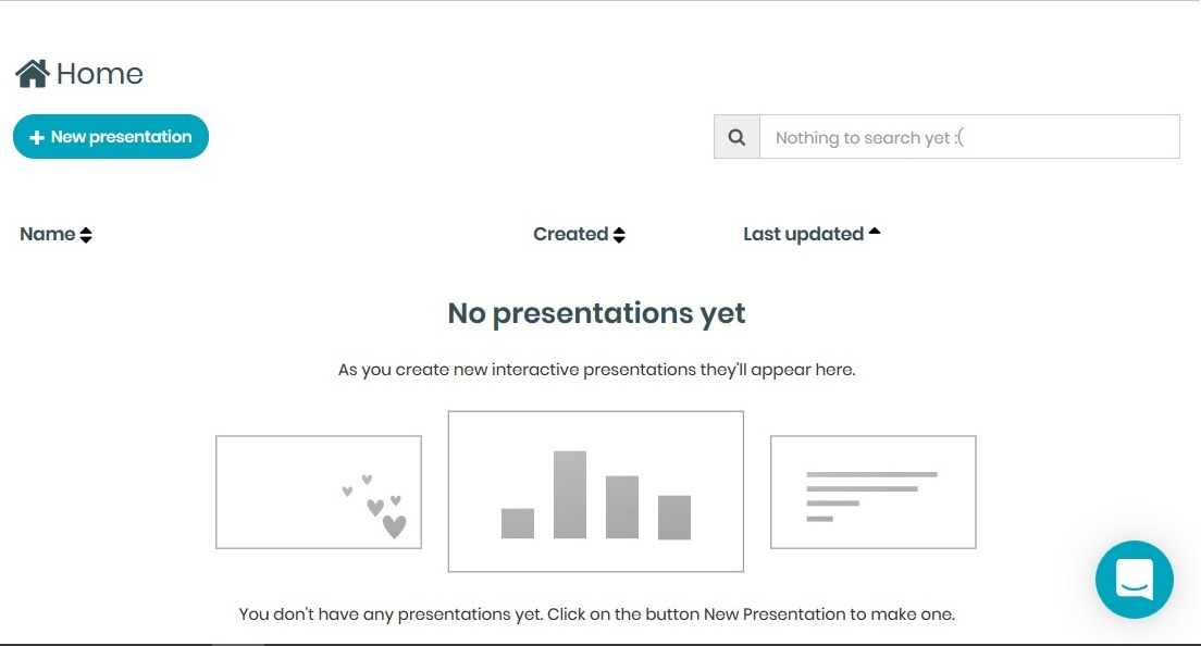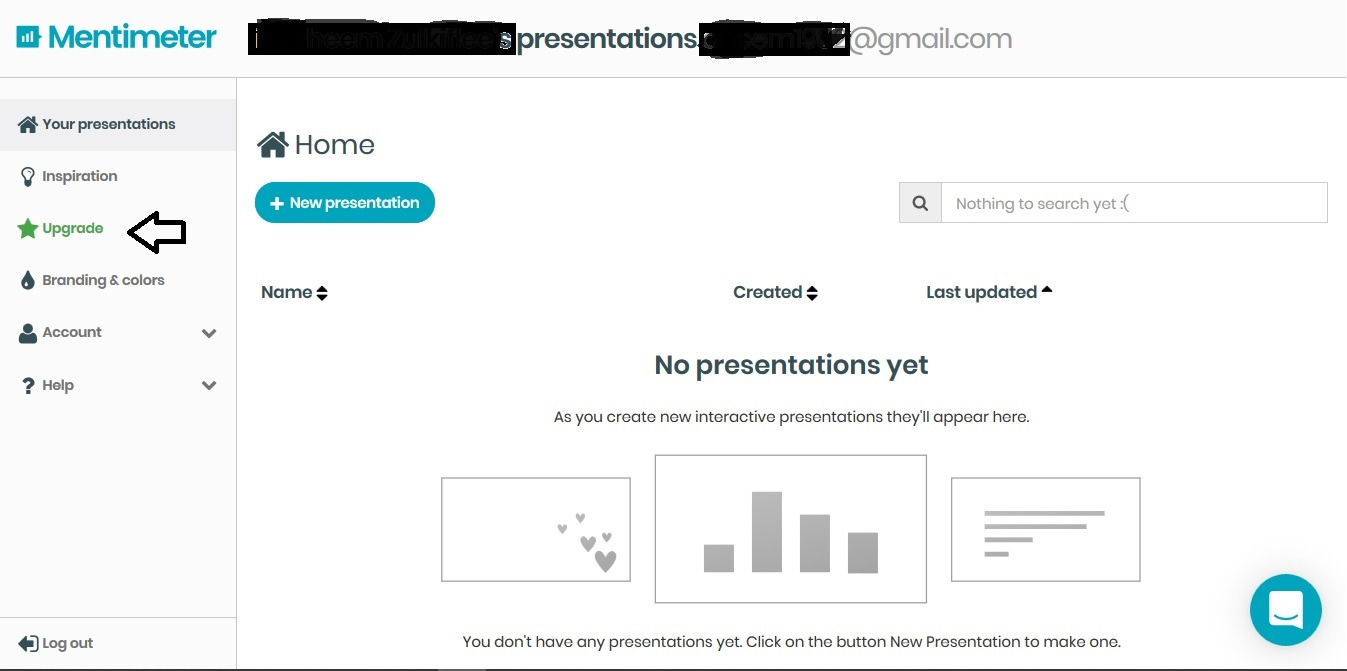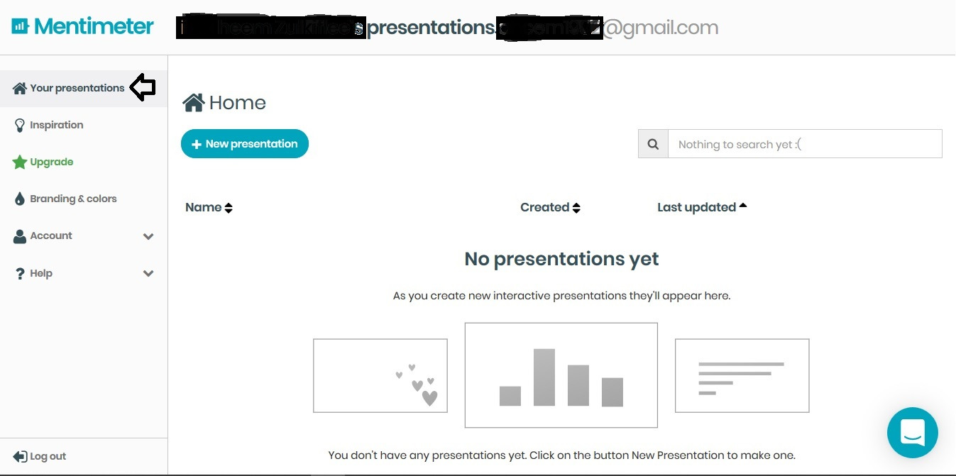 Kita lihat dahulu item Your presentations. Ini merupakan bahagian yang kita akan mulakan langkah untuk membuat mentimeter. Buat permulaan kita tiada lagi presentation kita jadi kita tidak dapat lihat apa yang kita telah buat. Di bahagian tengah terdapat butang + Nor presentation. Jangan klik dulu ye. Jom kita tengok next item.