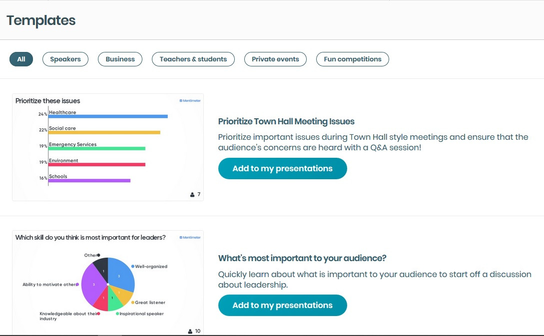Bahagian ini membolehkan kita mencari contoh yang telah dibuat dan dikongsikan untuk semua. Jika anda mahukan cara persembahan yang anda lihat, anda pelu klik add to my presentations. Admin sarankan anda ikut tutorial mentimeter supaya anda faham apa yang terdapat dalam mentimeter dan faham fungsinya.