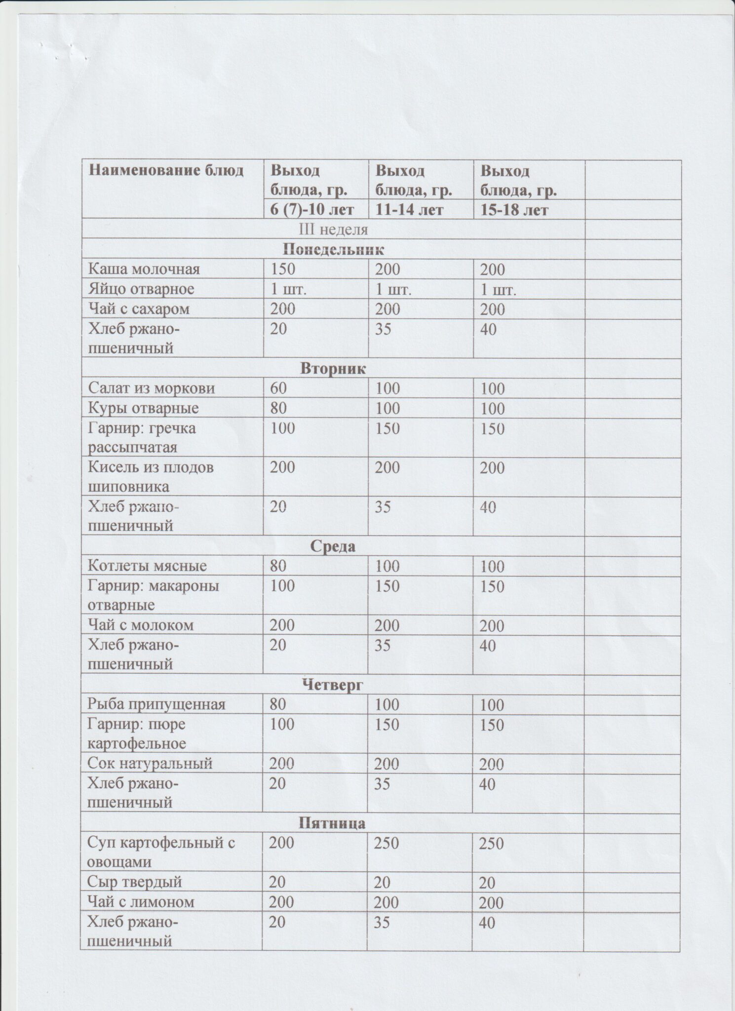 Меню на неделю в школе