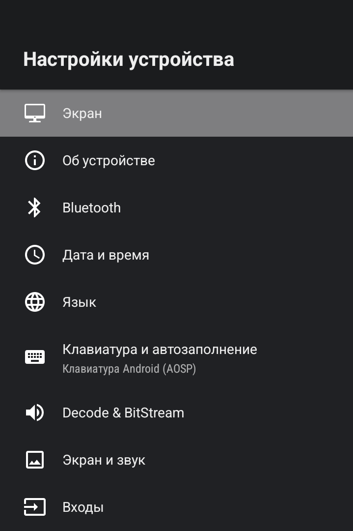 Меню настроек устройств