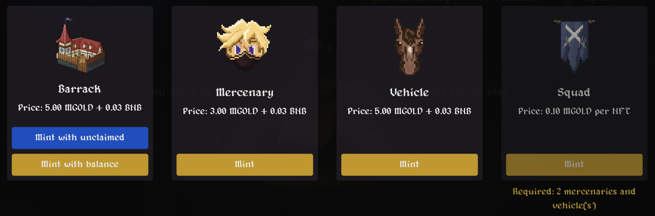 - Снизу нажимаем на значок пергамента "collections", нажимаем на синюю кнопку "MINT" и смотрим цены на минт барака, героев, средства передвижения и сквад