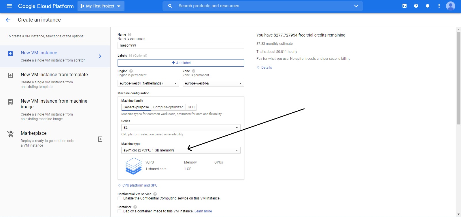 Выбираем e2-micro (2 vCPU, 1 GB memory), этого будет вполне достаточно