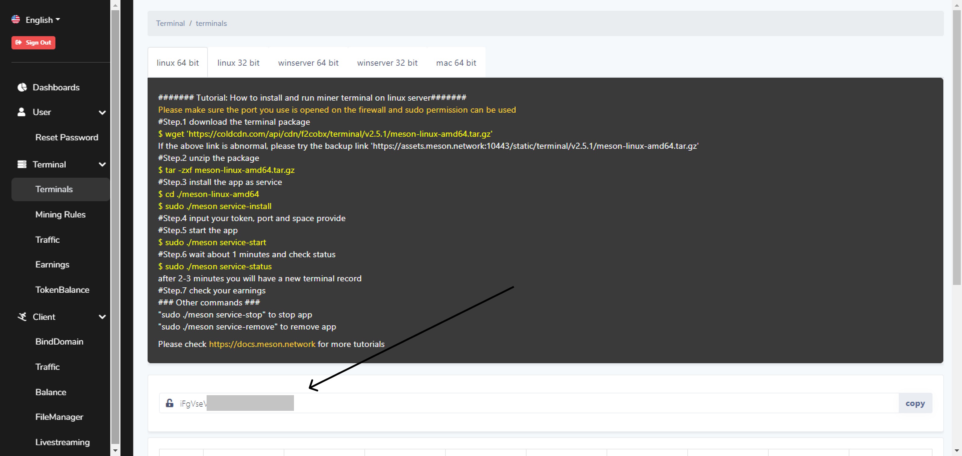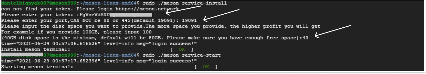 $ sudo apt update $ sudo apt upgrade -y $ wget https://coldcdn.com/api/cdn/f2cobx/terminal/v2.5.1/meson-linux-amd64.tar.gz $ tar -zxf meson-linux-amd64.tar.gz $ cd ./meson-linux-amd64 $ sudo ./meson service-install /// Вводим свой токен из терминала, порт (19091) и обем диска под майнер (40) /// $ sudo ./meson service-start /// Стартуем майнер ///