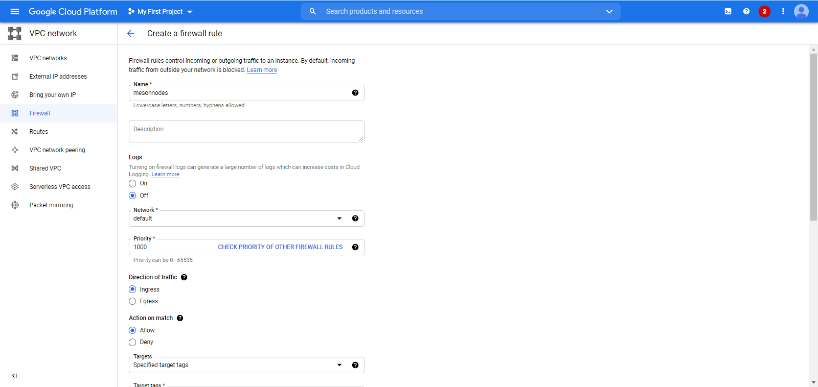В Name* придумываем имя нашему фаерволу (например mesonnodes)