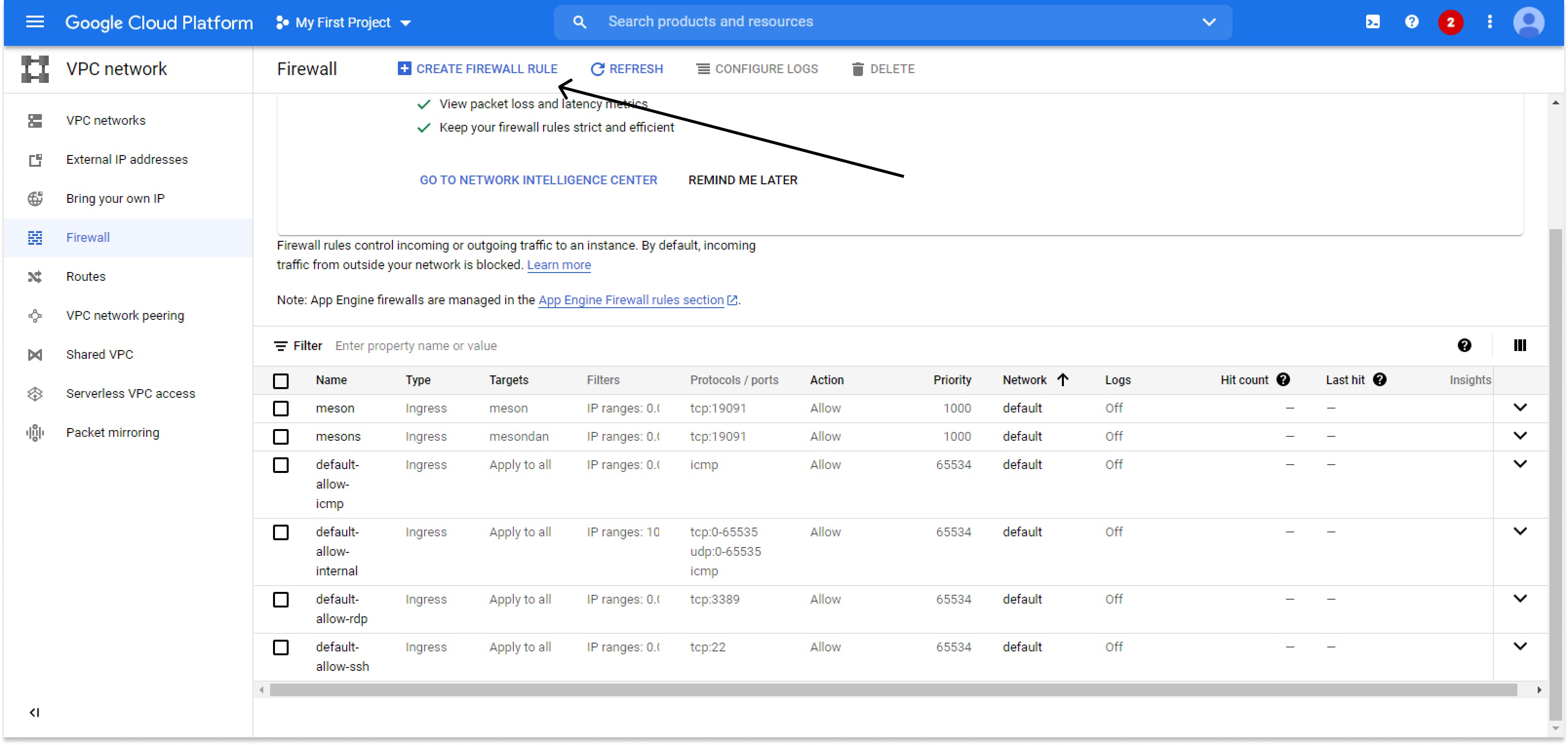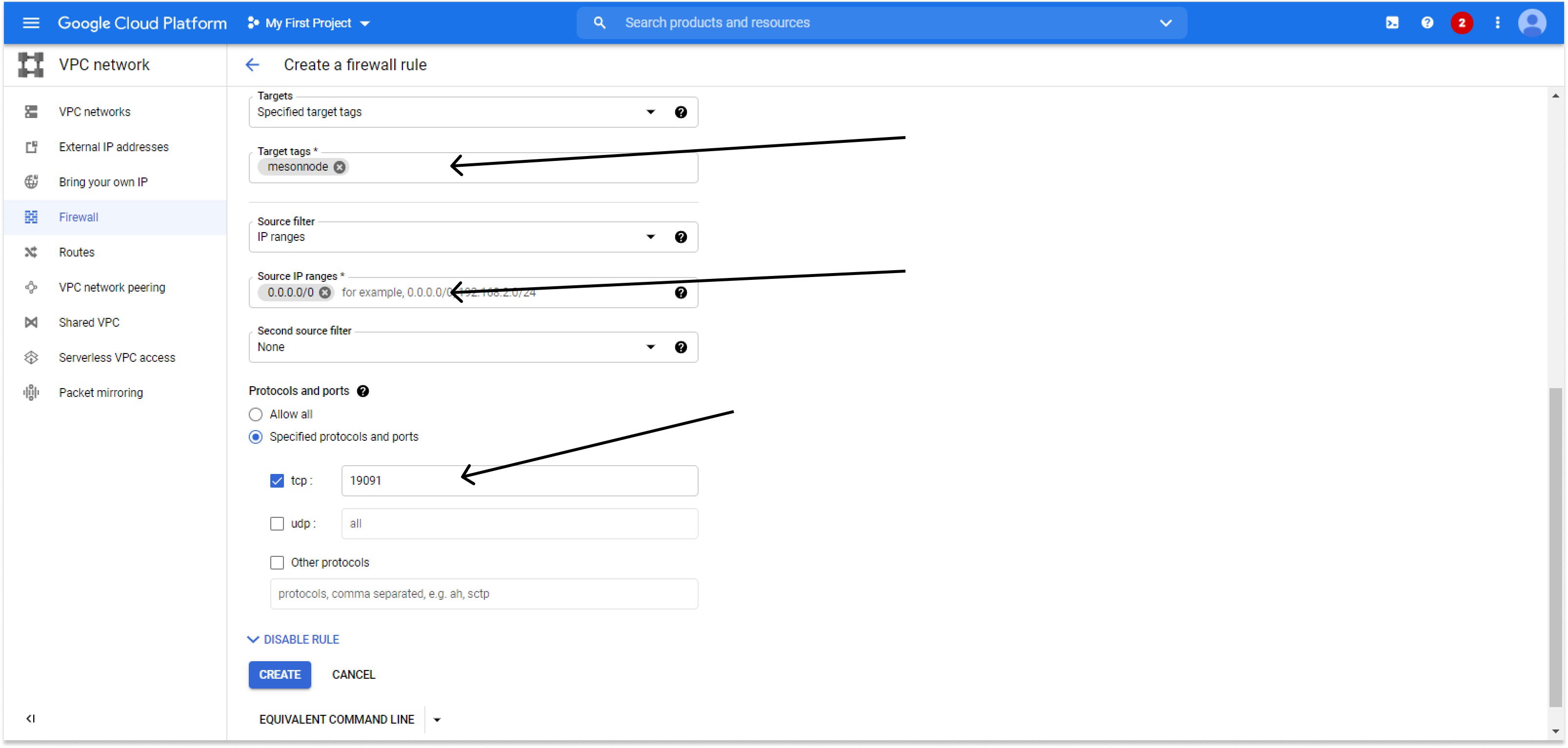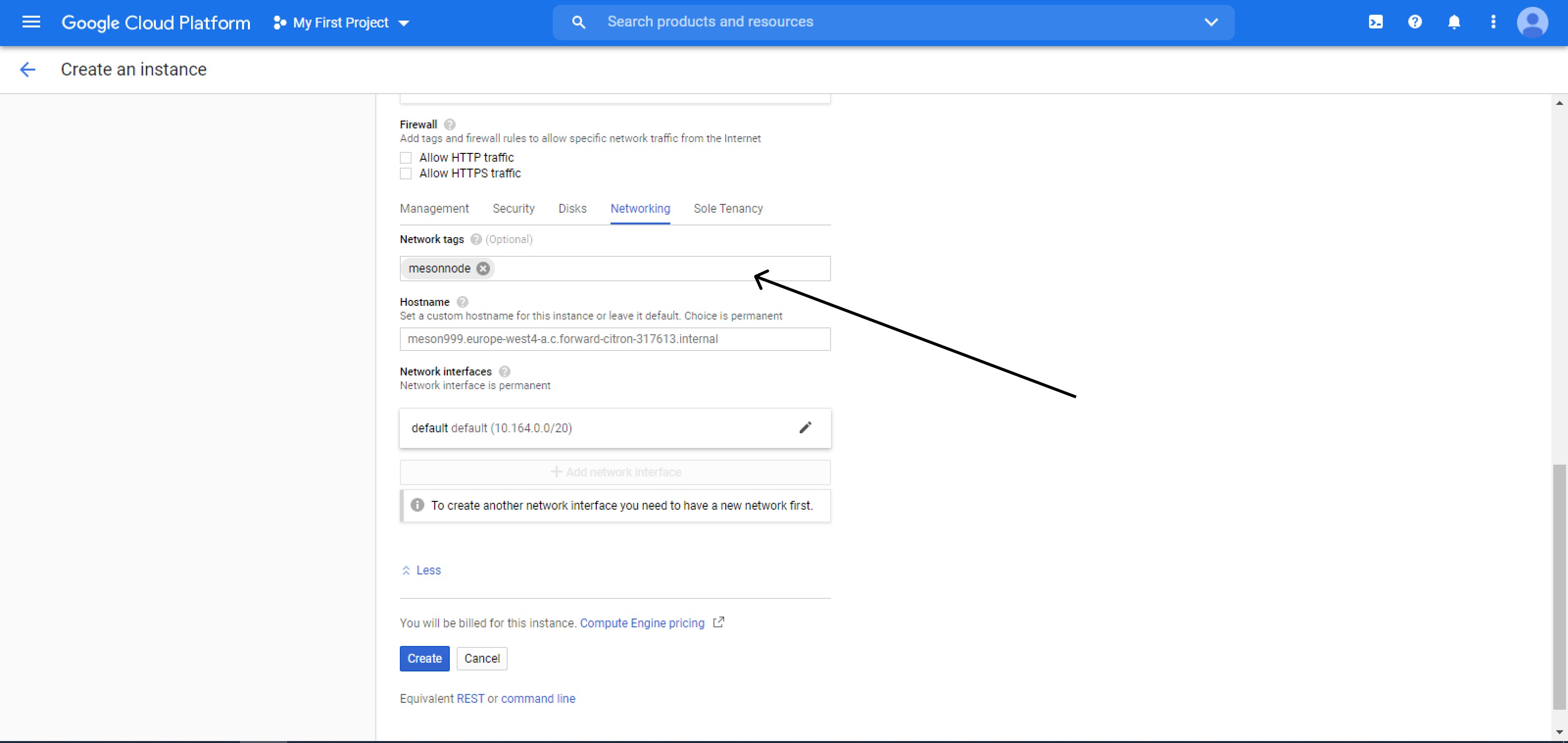 В networking tags придумаем тэг фаервола, который будем в дальнейшем использовать (например mesonnode) >>> Create
