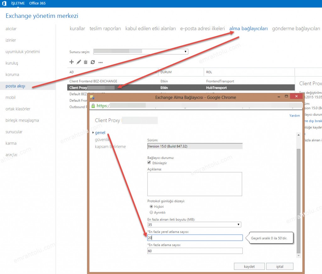 Now select the receive connector that is active on your own server. Most of the time it will be the "Default YOURSERVERNAME" connector. To change the maximum accepted header size use this command: