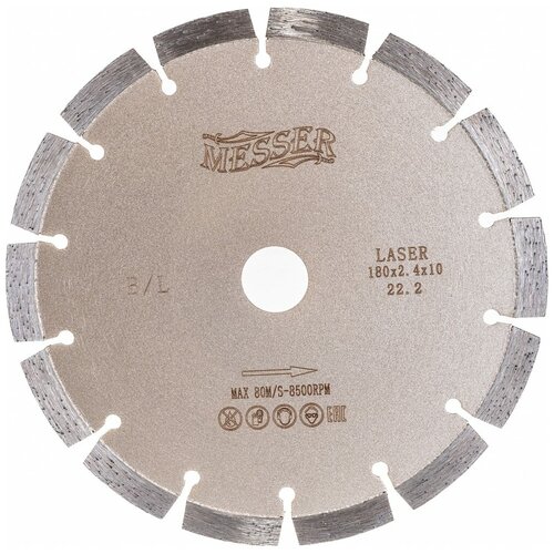 Elmas segmentli bıçak Messer B/L. Çap 180 mm (01-13-180) Marka: Messer Açıklama: Ürün: 370524 Kısa özellikler: Markanın anavatanı: Almanya Üretici: Ürün kodu: 370524 Genişlik: 185 mm Yükseklik: 8 mm Elmas segmental bıçak Messer B/L. Çap 180 mm (01-13-180)Marka: MesserAçıklama:Ürün: 370524Teknik özellikler Açıklama MESSER B/L'deki elmas segmentlerin lazerle kaynaklanması, su kaynağı olmadan kullanılmasına olanak sağlar. MESSER B/L 180mm segment diskinin özellikleri: Çap: 180 mm Montaj deliği: 22,2 mm (Müşterinin isteği üzerine montaj deliğini değiştirmek mümkündür) Segment genişliği: 2,4 mm Segment yüksekliği: 10 mm Segment sayısı disk: 14 adet Ek delik: Hayır