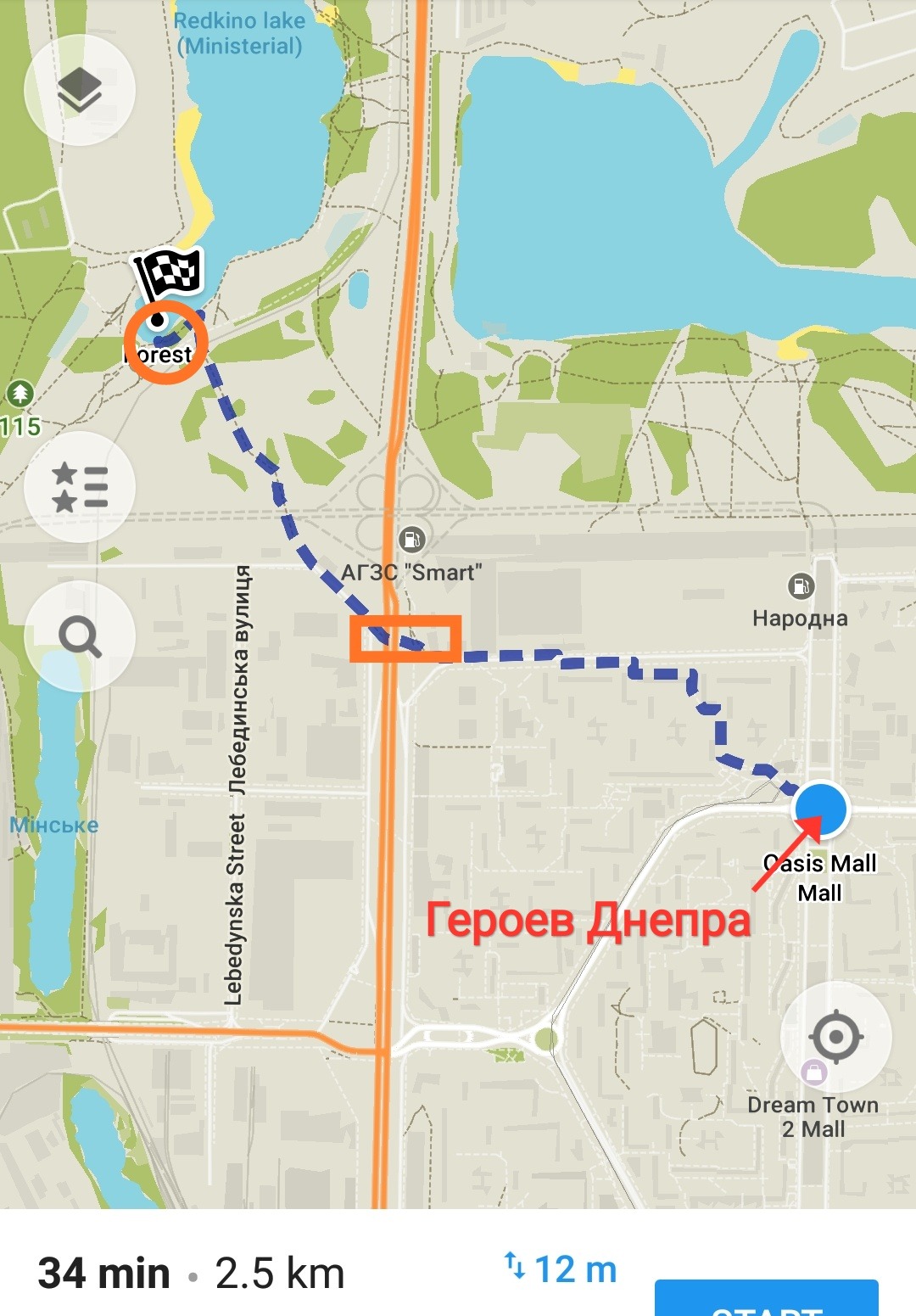 В таком случае путь займет 35 минут от транспортной развязки Героев Днепра: