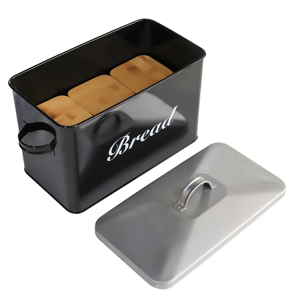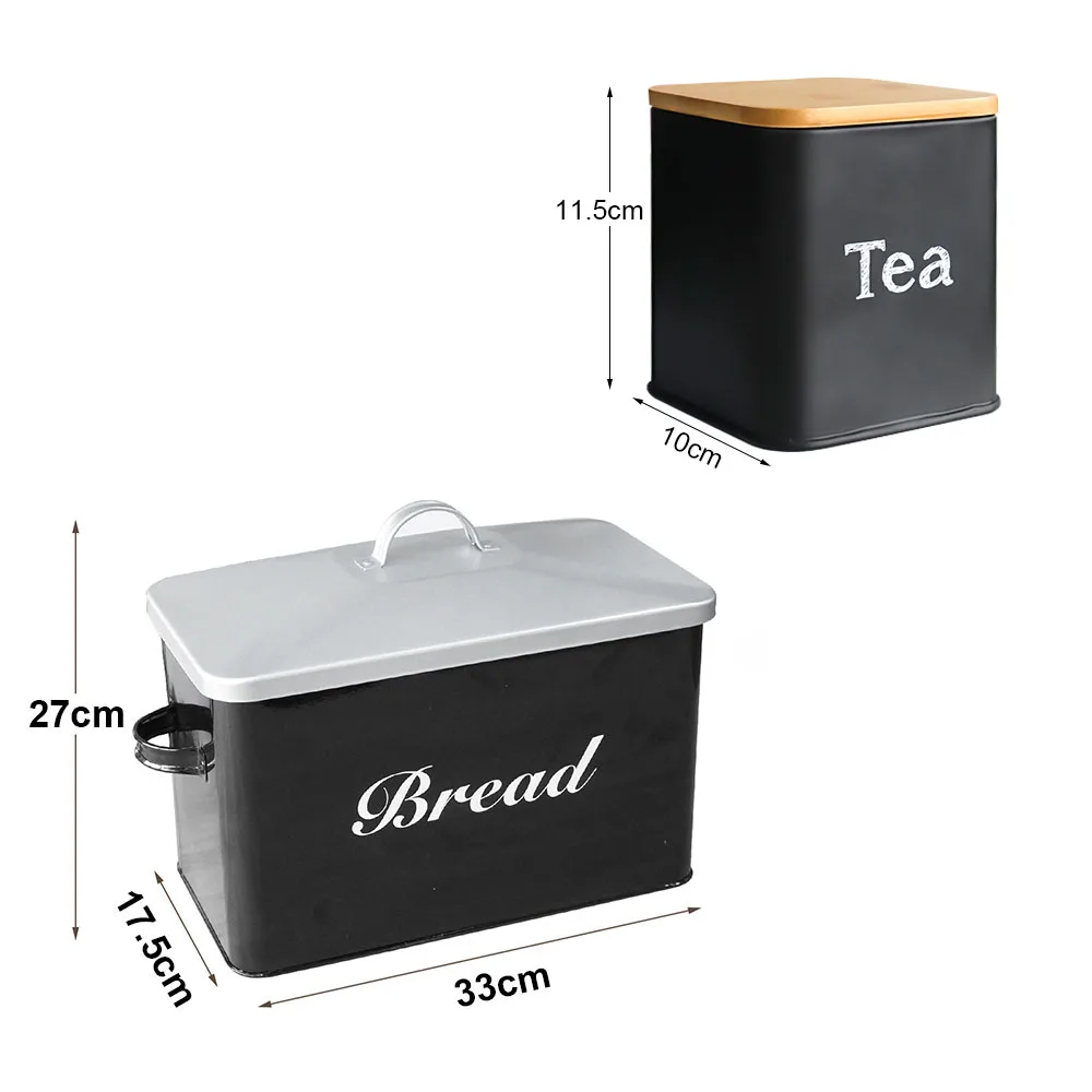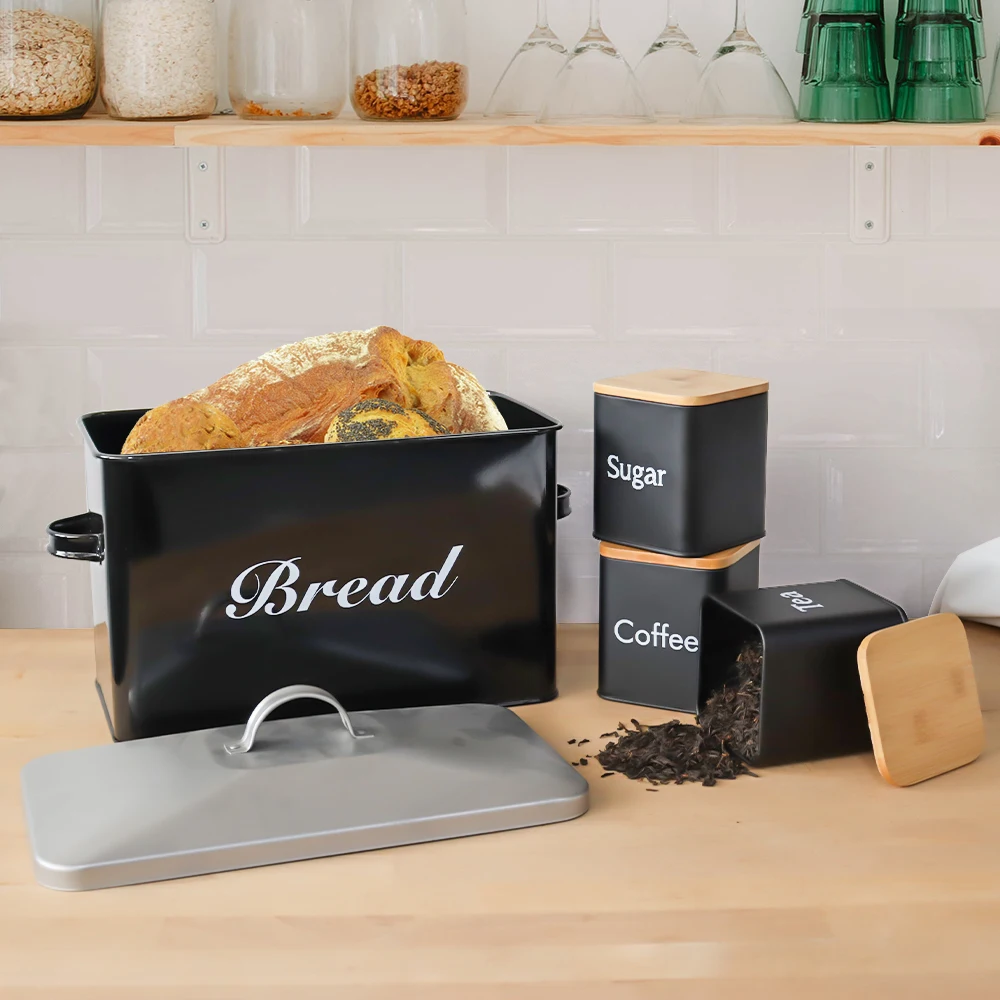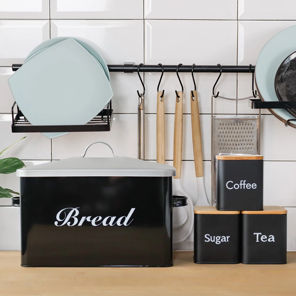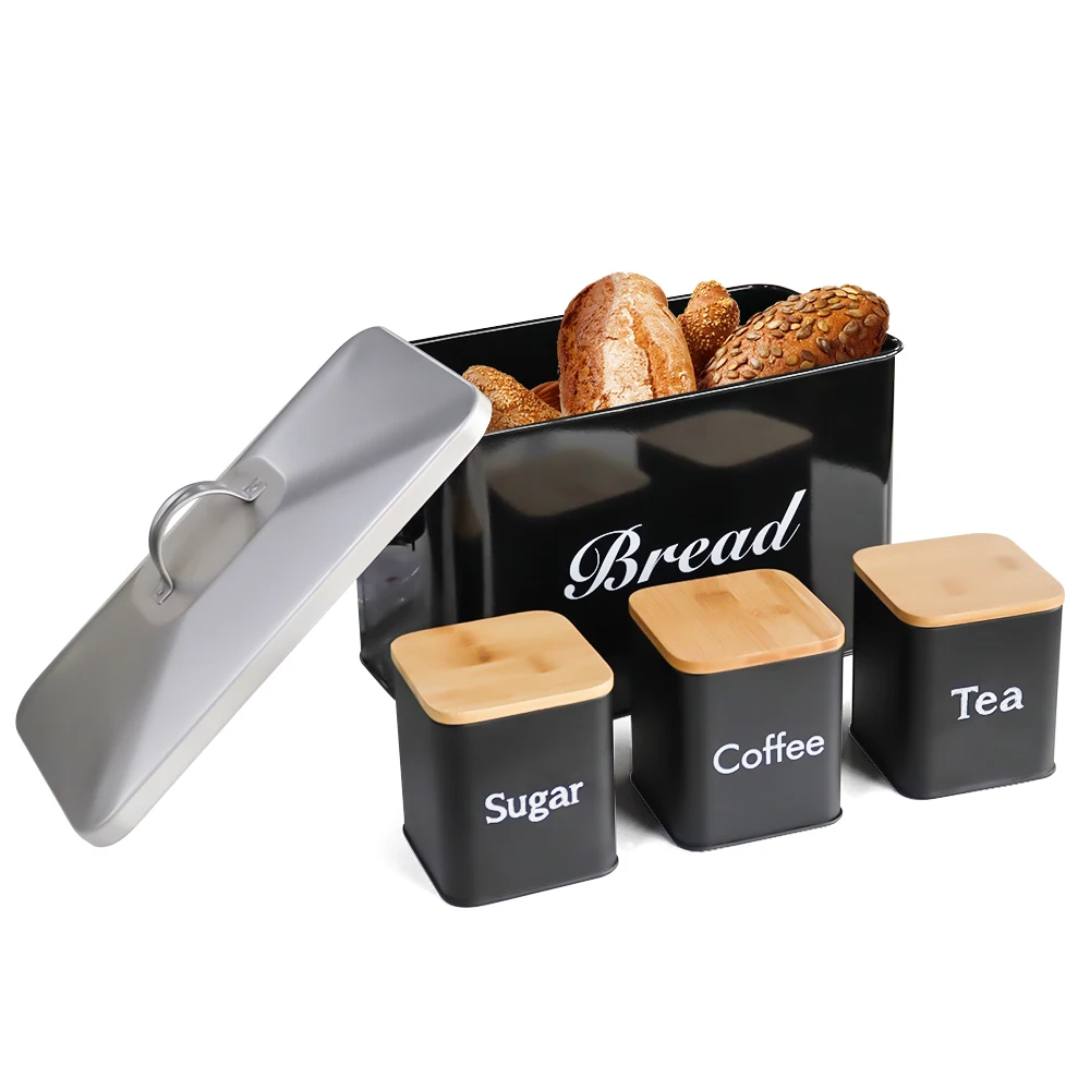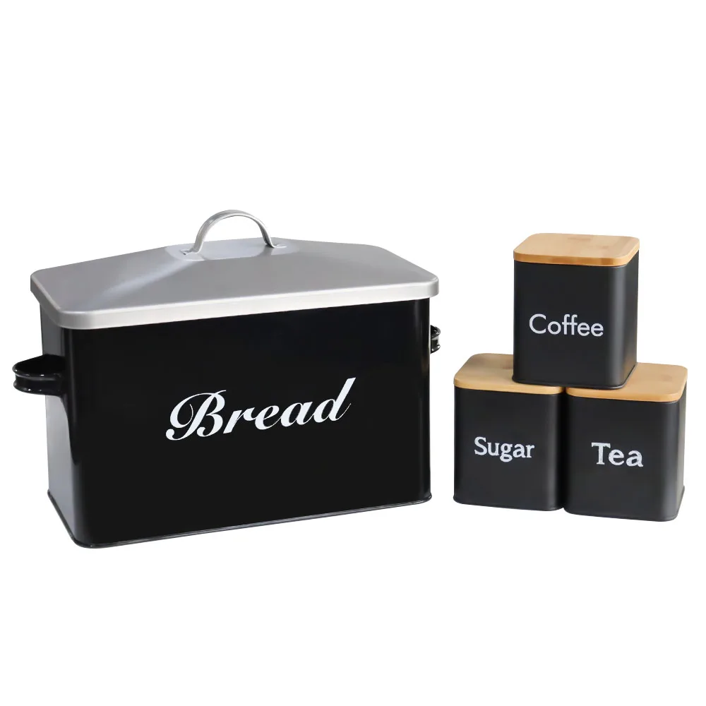 Metal Bread Box with 3pcs Coffee Sugar Tea Canister Kitchen Storage Container Set Black Bread Bin For Bread Snack Food Storage - Купить с бесплатной доставкой