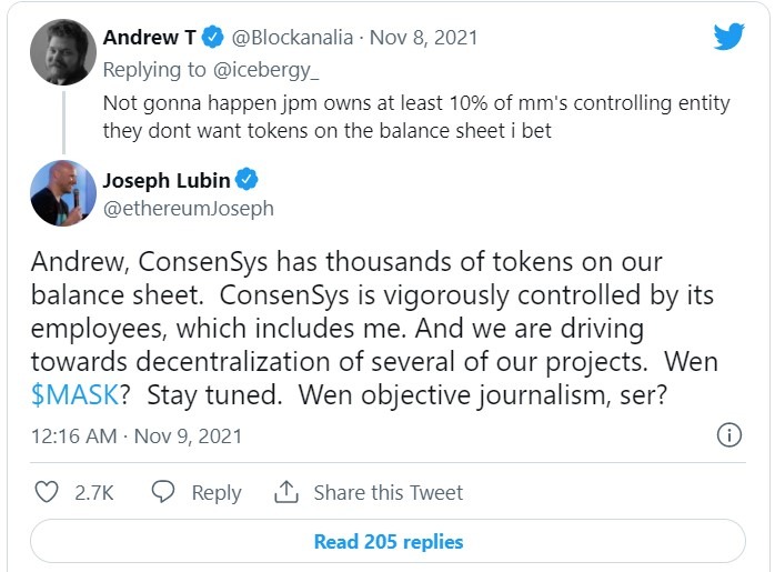 «Эндрю, у ConsenSys на балансе тысячи токенов. ConsenSys строго контролируется сотрудниками, в число которых вхожу и я. Мы движемся в направлении децентрализации нескольких наших проектов. Когда $MASK? Оставайтесь с нами»