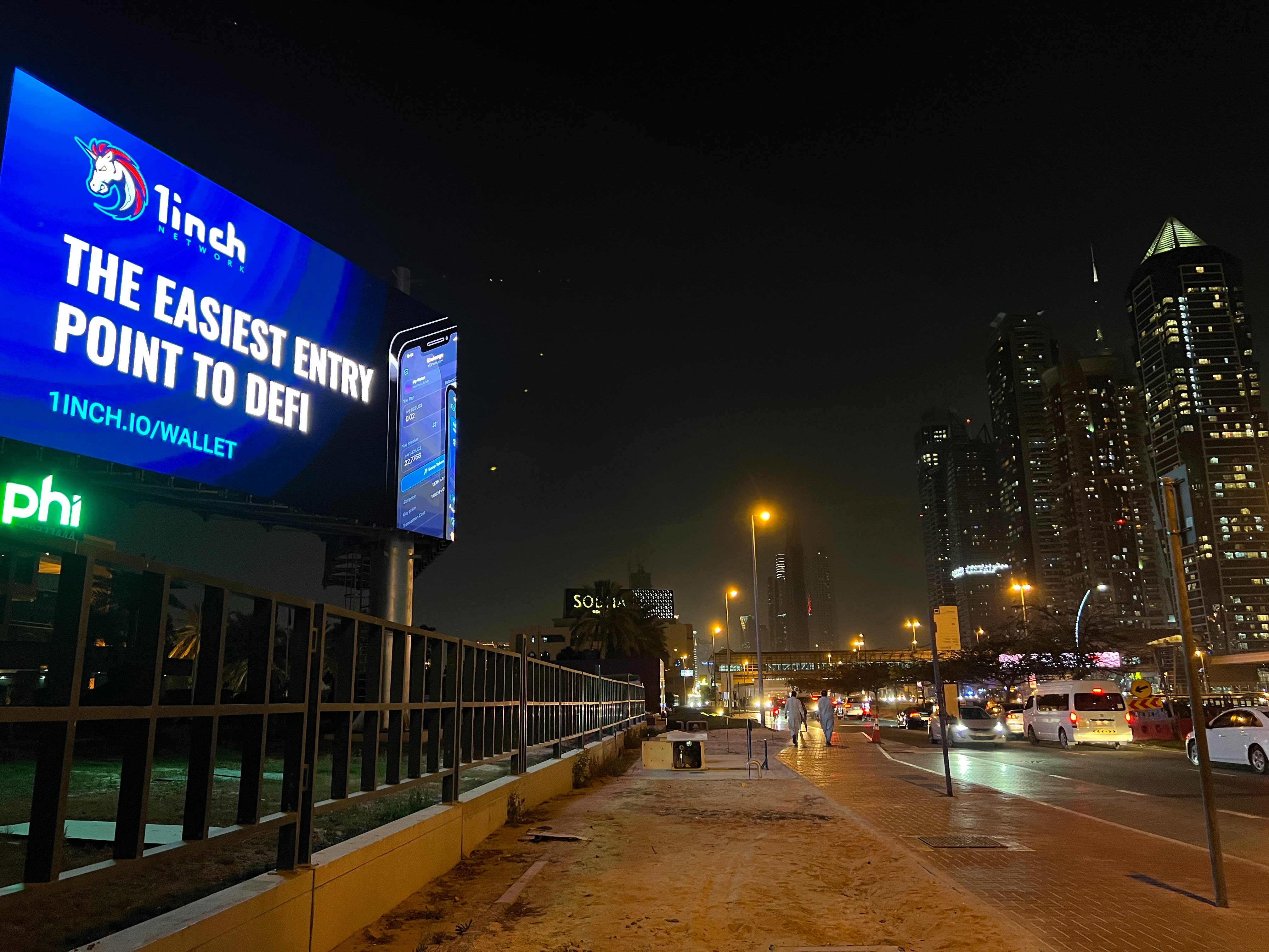 1inch закупили массовую оффлайн рекламу, такие и не только баннеры сейчас можно встретить в столице криптовалюты — Дубае.