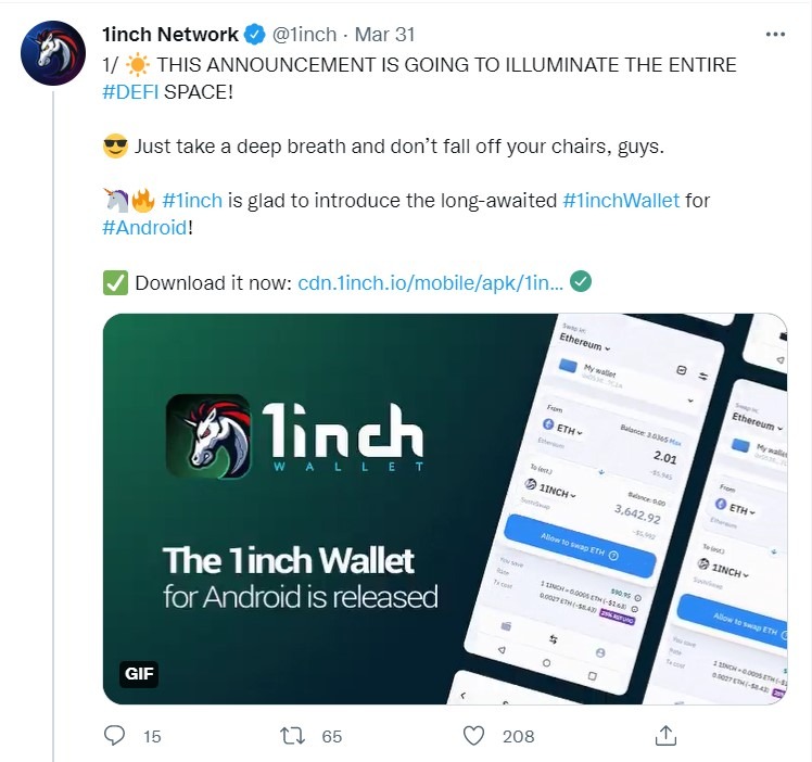 Реклама такого типа стоит там баснословных денег , это было сделано перед важным анонсом , сеть 1inch анонсировали запуск криптокошелька на андроид ОС.