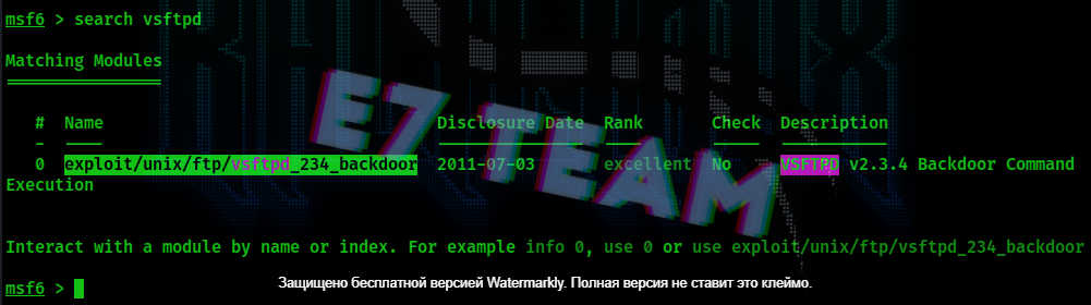 Далее мы запускаем MSF, выбираем интересующий нас порт и ищем эксплойт, для данной службы или сервиса. Например я хочу найти эксплойты для vsftpd, для этого в консоли MSF вводим: search vsftpd. Перед нами предстал один единственный exploit/unix/ftp/vsftpd_234_backdoor (рис.2).