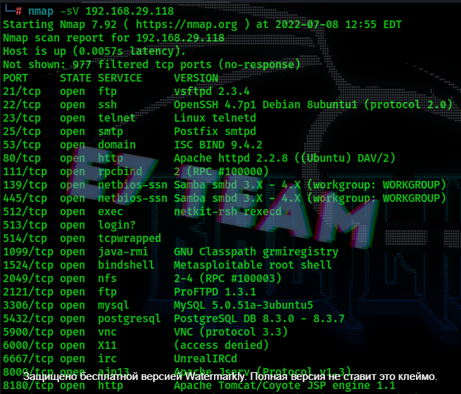 Итак, просканировав целевой хост, мы видим открытые порты с работающими на них службами и сервисами(рис.1).
