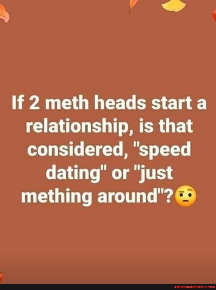 Two meth heads start a relationship, is that considered speed dating . Close . 8 .0k . Posted by 1 year ago . Archived . Two meth heads start a relationship, is that considered speed dating . or just mething around? 80 comments . share . save . hide . . . . Query: How do meth heads ask for meth ? The English "th" sound requires teeth to produce . 83 . Share . . .