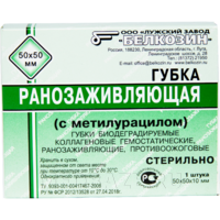 Губка ранозаживляющая представляет собой пластину белого цвета пористой структуры, со специфическим запахом уксусной кислоты, с рельефной поверхностью . Губки ранозаживляющие готовят из раствора коллагена . В состав губки ранозаживляющей входит метилурацил . ПОКАЗАНИЯ К ПРИМЕНЕНИЮ: Рассчитать доставку