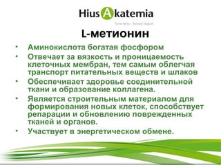 Метионин является незаменимой аминокислотой, которая отвечает за переработку и сжигание жиров в организме . Она содержит серу - вещество, необходимое организму для производства наиболее распространенного антиоксиданта под названием глутатион .