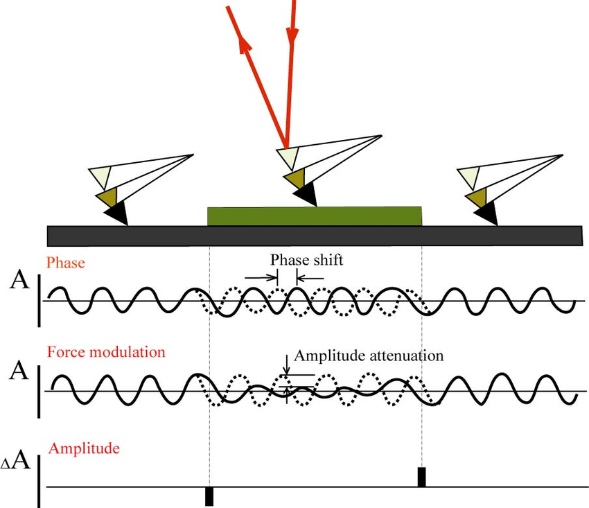 Метод модуляции силы реализуется следующим образом: в процессе сканирования на Z-секцию сканера подается дополнительное модулированное напряжение, вследствие чего совершаются вертикальные периодические колебания сканера. В соответствии с локальной жесткостью поверхности образца изменяются величина продавливания образца и изгиб кантилевера. На жестких участках поверхности величина прогибов от зонда будет маленькая, а величина изгиба самого кантилевера большой. На мягких же участках глубина прогибов поверхности увеличится, а величина изгиба кантилевера – уменьшится (рисунок 1).