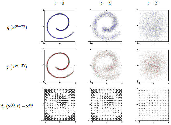 Как было показано Колмогоровым, любому уравнению прямой диффузии, описывающему вероятность того, что частица с координатой x⁽ᵗ⁻¹⁾ в момент времени t–1 окажется в точке x⁽ᵗ⁾ в следующий момент времени t, можно сопоставить сопряженное уравнение, описывающее обратный процесс. Иными словами, существуют два уравнения для прямой и обратной эволюции условной плотности вероятности p(x⁽ᵗ⁾|x⁽ᵗ⁻¹⁾), переходящие друг в друга при обращении времени. Но в уравнении обратной диффузии скорость дрейфа μ и коэффициенты диффузии Σ уже обязательно будут зависеть от координат. А сама форма этой зависимости будет определяться начальной плотностью f(x⁽⁰⁾) облака диффундирующих частиц.