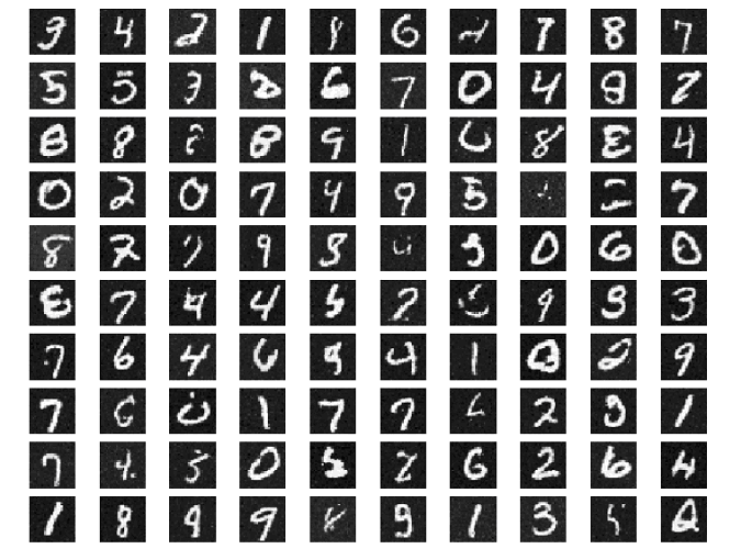Обучение, как обычно, проводится минимизацией некоторой функции ошибок, которую можно найти, если у нас имеется достаточно большая и репрезентативная библиотека изображений нужного нам типа – то есть векторов x⁽⁰⁾, встречающихся с плотностью вероятности, близкой к целевой плотности f(x⁽⁰⁾). Вот пример изображений, генерируемых обратной диффузией после обучения нейросети на библиотеки изображений рукописных цифр MNIST. Как видно, они (в большинстве) достаточно реалистичны и при этом не совпадают с библиотечными, то есть каждое изображение уникально.
