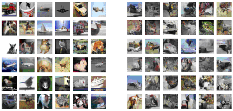 Вот еще пример: слева показаны несколько изображений из библиотеки маленьких картинок CIFAR-10, а справа – результаты генерации методом обратной диффузии. Видно, что, хотя сгенерированные картинки зачастую бессмысленны, статистически – в плане того, как цвета пикселей соотносятся между собой на малых и на больших расстояниях – они похожи на реальные.