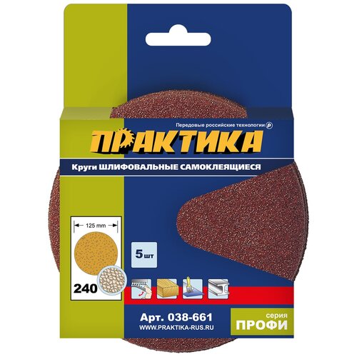 Meules autocollantes sans trous Praktika 038-661 à utiliser avec une plaque de support sur meuleuses d'angle et perceuses. Couche abrasive en électrocorindon. Convient aux revêtements de bois tendres et durs, de contreplaqué, de métal, de peinture et de vernis. Dans un emballage en carton semi-ouvert avec un euro-trou, 5 pcs.