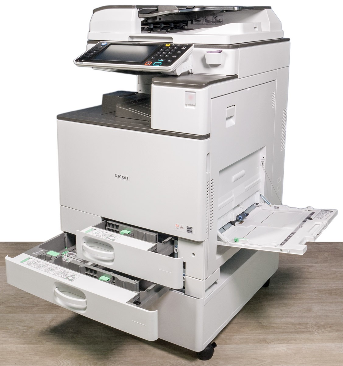 ricoh mp c2011sp - полноцветное МФУ формата А3: лазерный копир, сетевые pcl-принтер и сканер - со скоростью печати 20 страниц А4 в минуту во всех режимах и реверсивным автоподатчиком оригиналов .