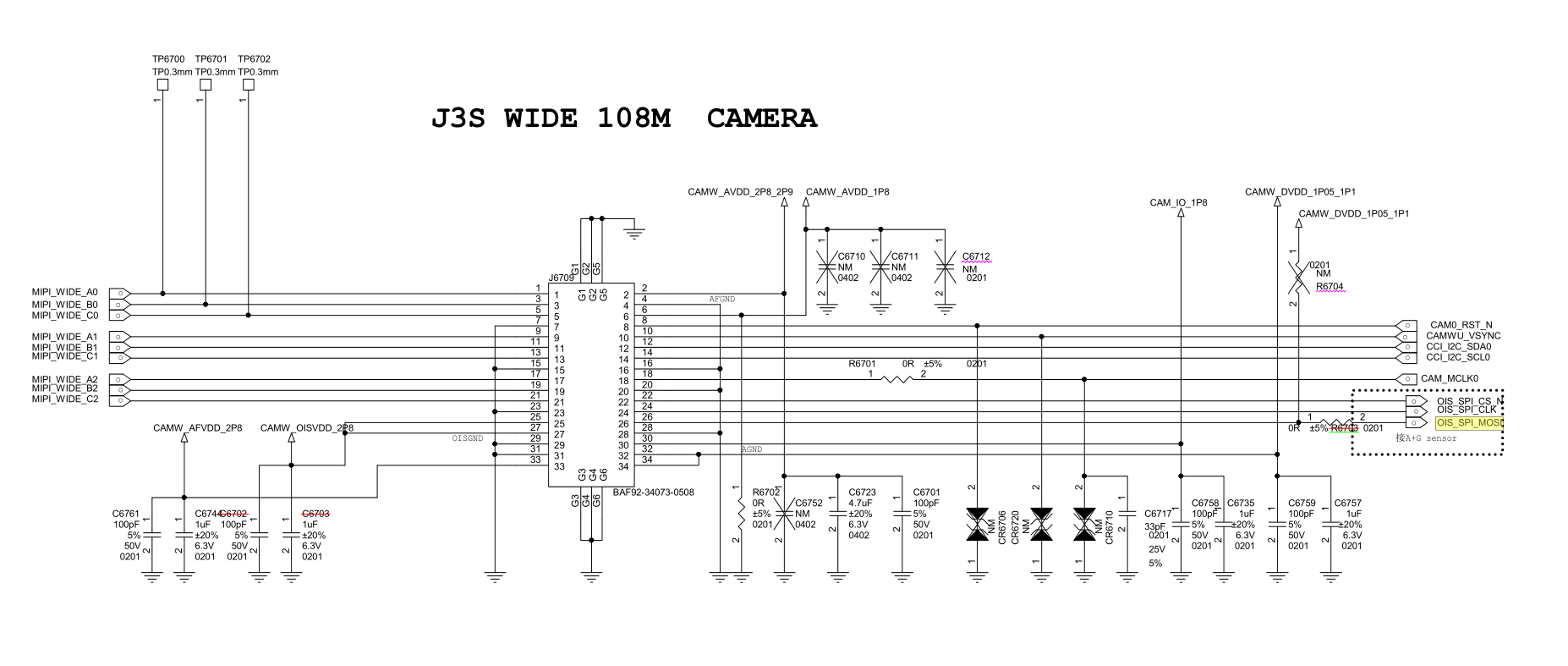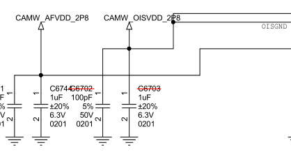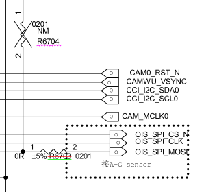 On the far left, the schematic shows the connections to the accelerometer + gyro sensor. On the Std version R6703 is absent which seems to indicate that one of the pin (OIS_SPI_MOSI) isn't connected to the module. R6704 is absent on the Pro version for some reason (any pros know why ?). C6712 is another component that is on the Std but not the Pro, I don't think this influences OIS.