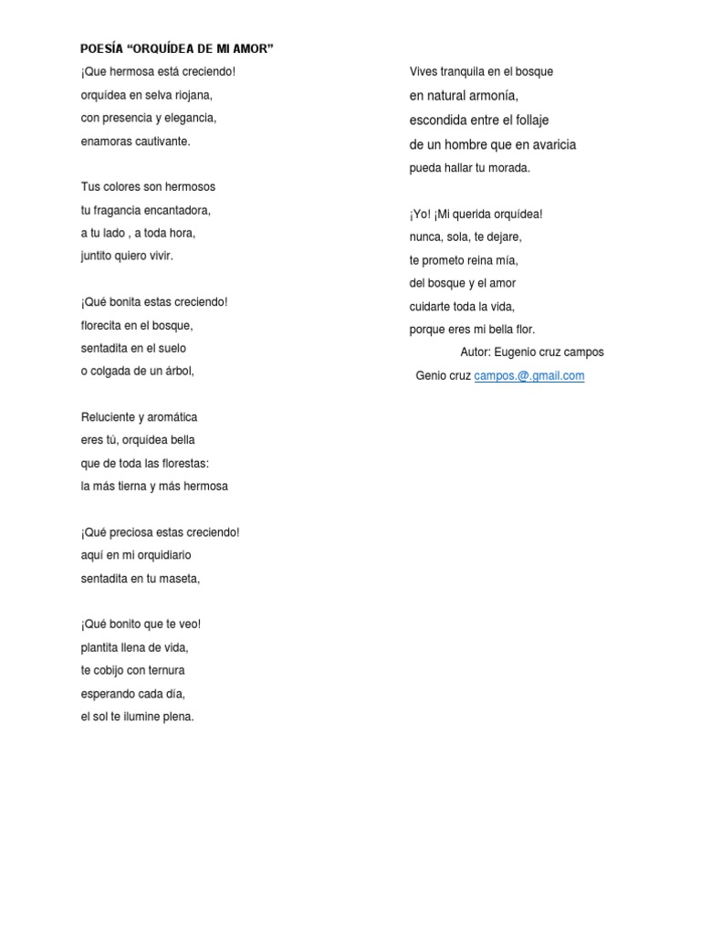 Oh mi dulce florecita algún día te abrirás, con tus pétalos de fragancia y tus botones en abundancia . Con esas hojas que son mi delirio y con esas espinas que son mi suplicio, eres tú mi dulce florecita quién con esa tierna carita me roba los suspiros . Tú no puedes caminar, ni menos puedes hablar, pero con tu inmaculada belleza me dices todo con gran certeza .