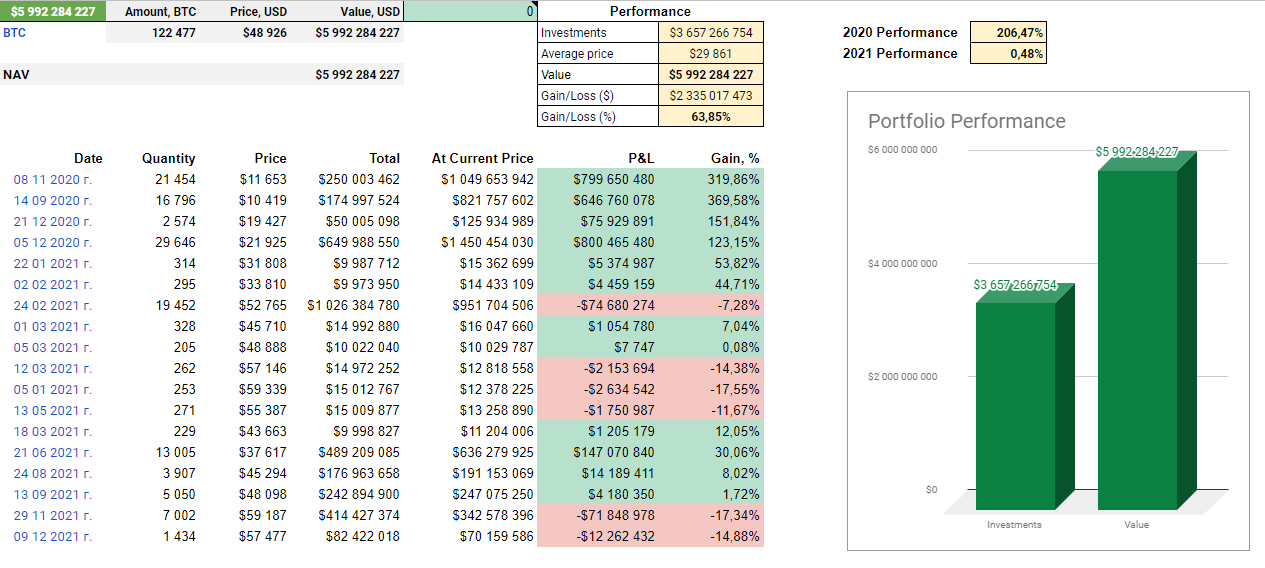 Но вернусь к Microstrategy. Чтобы понять что они что-то мутят, нужно вернуться к цифрам. Я сделал дэшборд, который отражает все их операции за 2020-2021 годы. Основной вывод, который можно видеть: начав хайповать в 2020 и выведя биток на информационные орбиты, Microstrategy имеет хорошую доходность по прошлому году с учетом текущей цены. Но, если брать 2021 год, то они упорно продолжают покупать, игнорируя все финансовые расчеты и законы. Доходность по инвестициям текущего года на сейчас - 0,48%! Они идиоты? Не думаю. А вот что отрабатывают заказ на чужие деньги - думаю. У меня нет прямых доказательств, кроме как посчитать цифры. Появится такая инфа, я напишу.