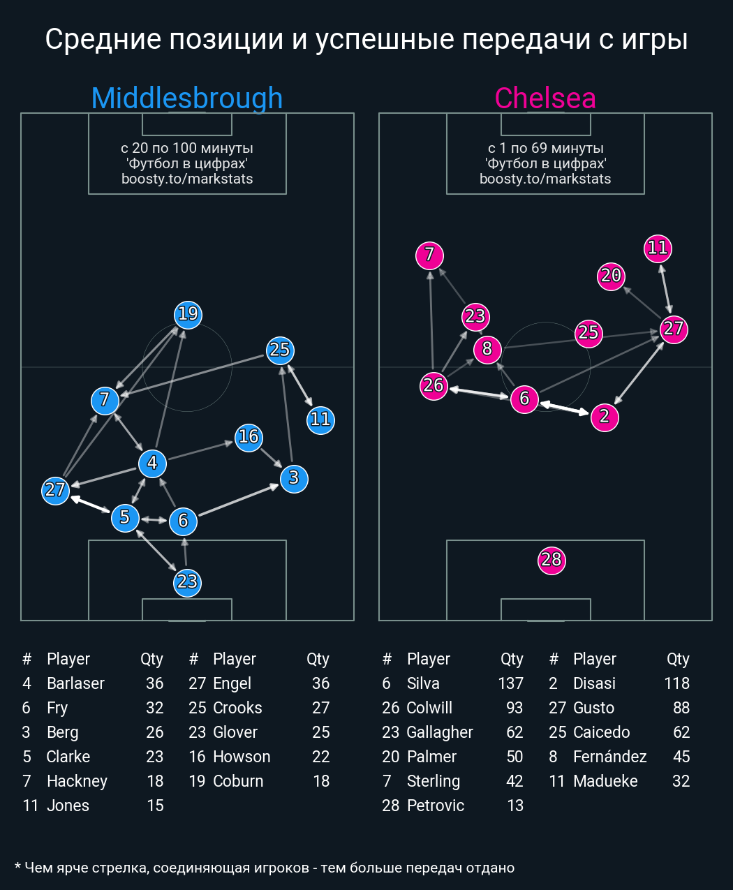 115 успешных передач из 119 попыток (6 с продвижением, 14 на трети соперника)