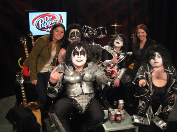 "Dr . Love- Little Kiss" . rock band Kiss drinks Dr . Pepper before going on stage with midget Kiss band .