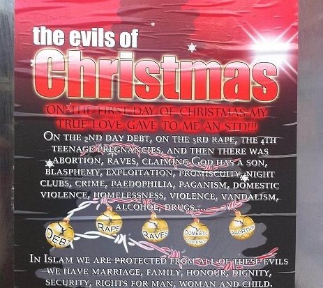 Мусульмане расклеивают постеры, в которых написано, что празднование Рождества есть корень всякого зла, что оно ведет к изнасилованиям, долгам, педофилии, абортам, вандализму и прочему!