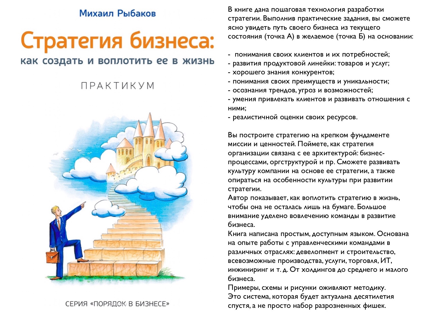 В книге я делюсь нашим опытом работы над стратегией в компаниях России и стран СНГ – от холдингов до среднего и малого бизнеса, в различных отраслях: девелопмент и строительство, всевозможные производства, услуги, торговля, ИТ, инжиниринг и т. д. Рассказываю о находках, успехах и трудностях. Вы изучите не только пошаговую технологию, но и живые примеры от владельцев и топов.
