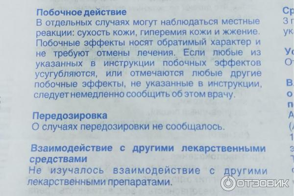 Побочное действие Могут наблюдаться реакции в месте применения: сухость кожи, гиперемия кожи и жжение . Побочные эффекты носят обратимый характер и не требуют отмены лечения .