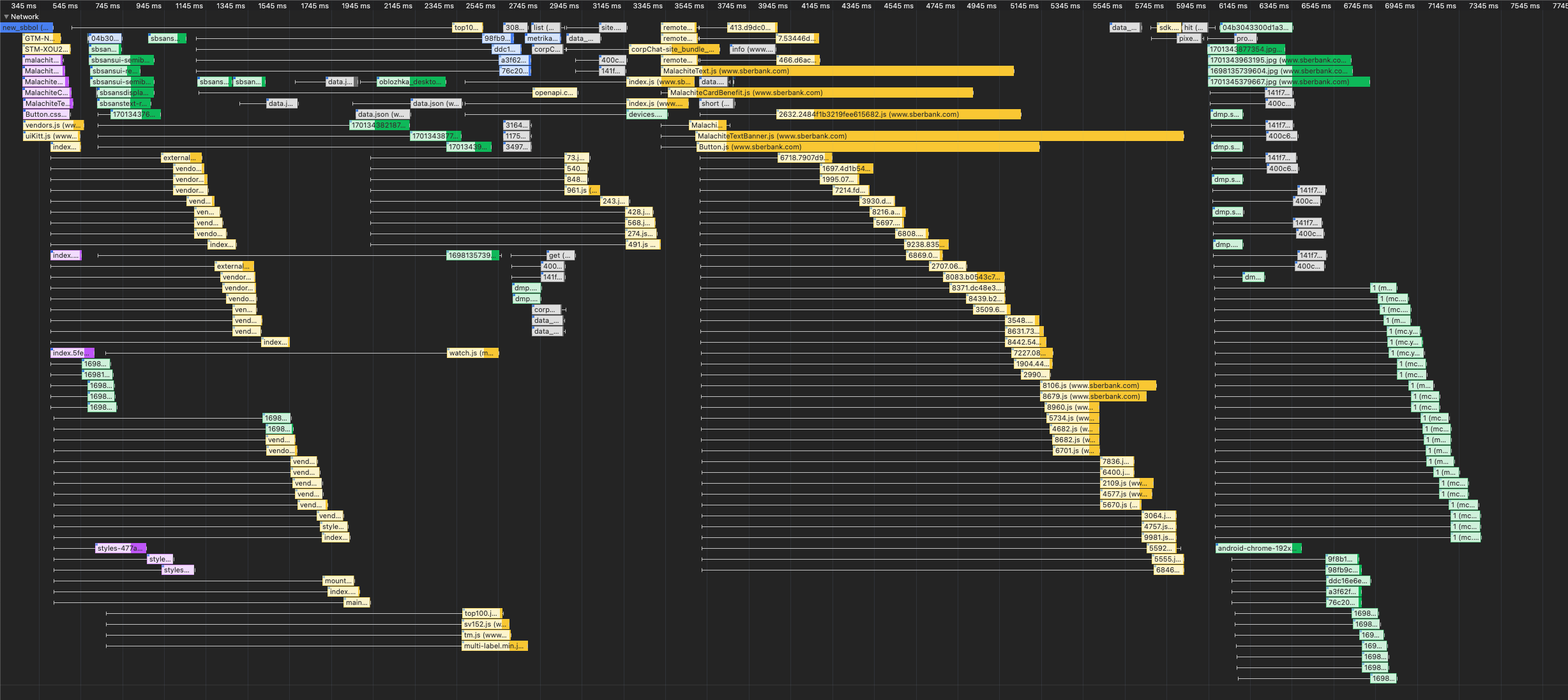 Я начну с триггеров проверки. Откройте devtools (или аналог в другом браузере), вкладка Perfomance, сделайте слепок профиля нагрузки при загрузки сайта, разверните колапсер с network, если у вас там лесенка, как на картинке 1, а на вкладке Network в поле Protocol* гордо красуется http/1.1 - идите к вашему админу/бэкендиру и просите, чтобы они сделали "что-то с этим", например, перевести все узлы на HTTP/2 и HTTP/3.