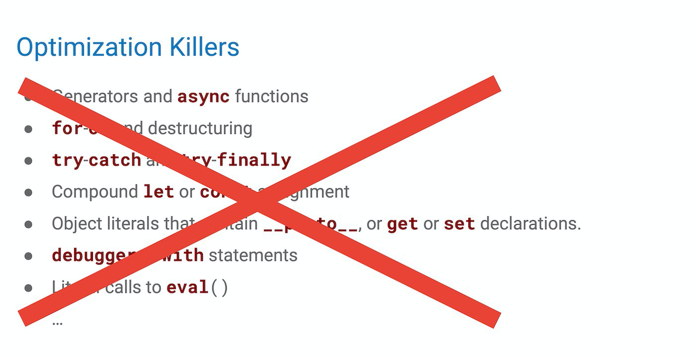 Существуют ли «убийцы оптимизации», когда новая хайповая конструкция языка превращается в тонну неэффективного кода? Безусловно. У каждого движка есть свои проблемы, и ещё не все оптимизации сделаны. Должны ли мы об этом беспокоится, чтобы уже сегодня наш код работал быстрее?