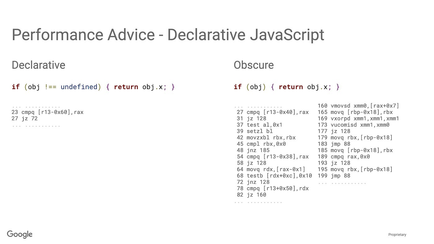 Бенедикт Маурер, один из разработчиков движка V8, приводит достаточно наглядные примеры того как использование новых синтаксических конструкций приводит к оптимизации выходного машинного кода.