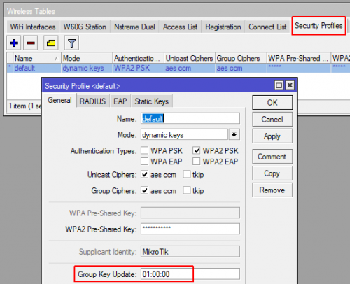 Мы можем увеличить интервал обновления временного ключа. В Mikrotik это параметр «group-key-update» . По умолчанию он 5 минут, ставим 1 час.
