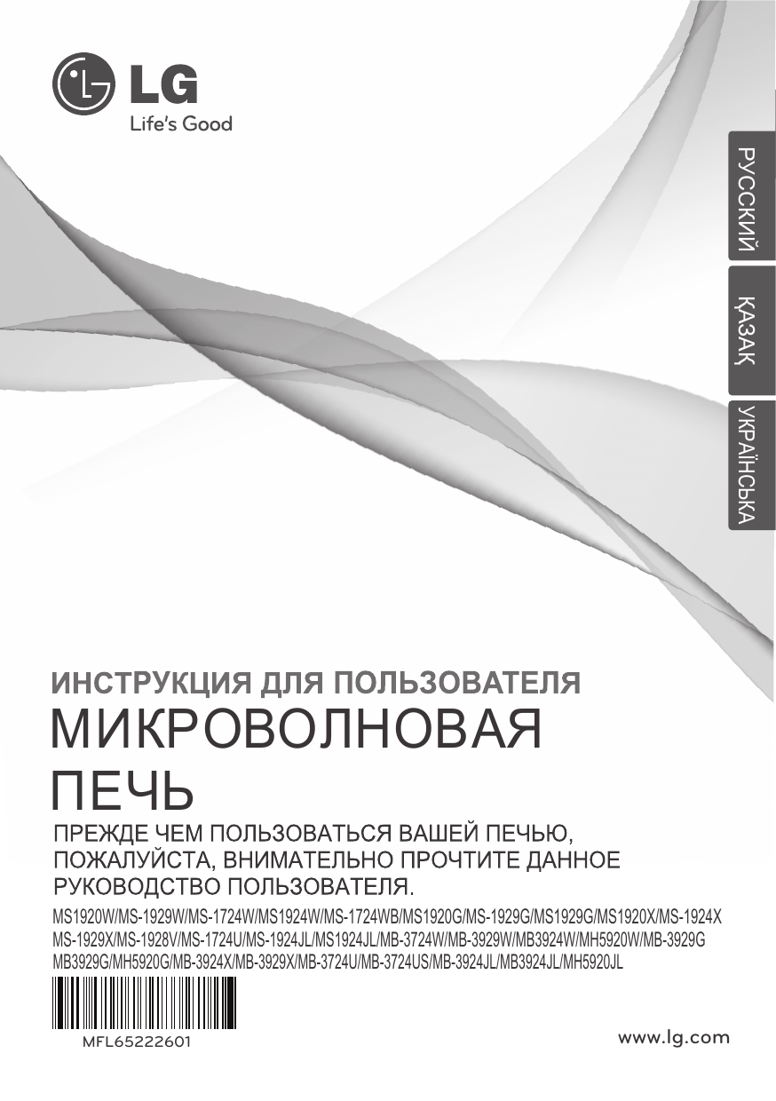 english МИКРОВОЛНОВАЯ ПЕЧЬ www . lg .com pУССКИЙ ҚАЗАҚ УКРАЇНСЬКА ms1920w/ms-1929w/ms-1724w/ms1924w/ms-1724wb/ms1920g/ms- 1929g . . .