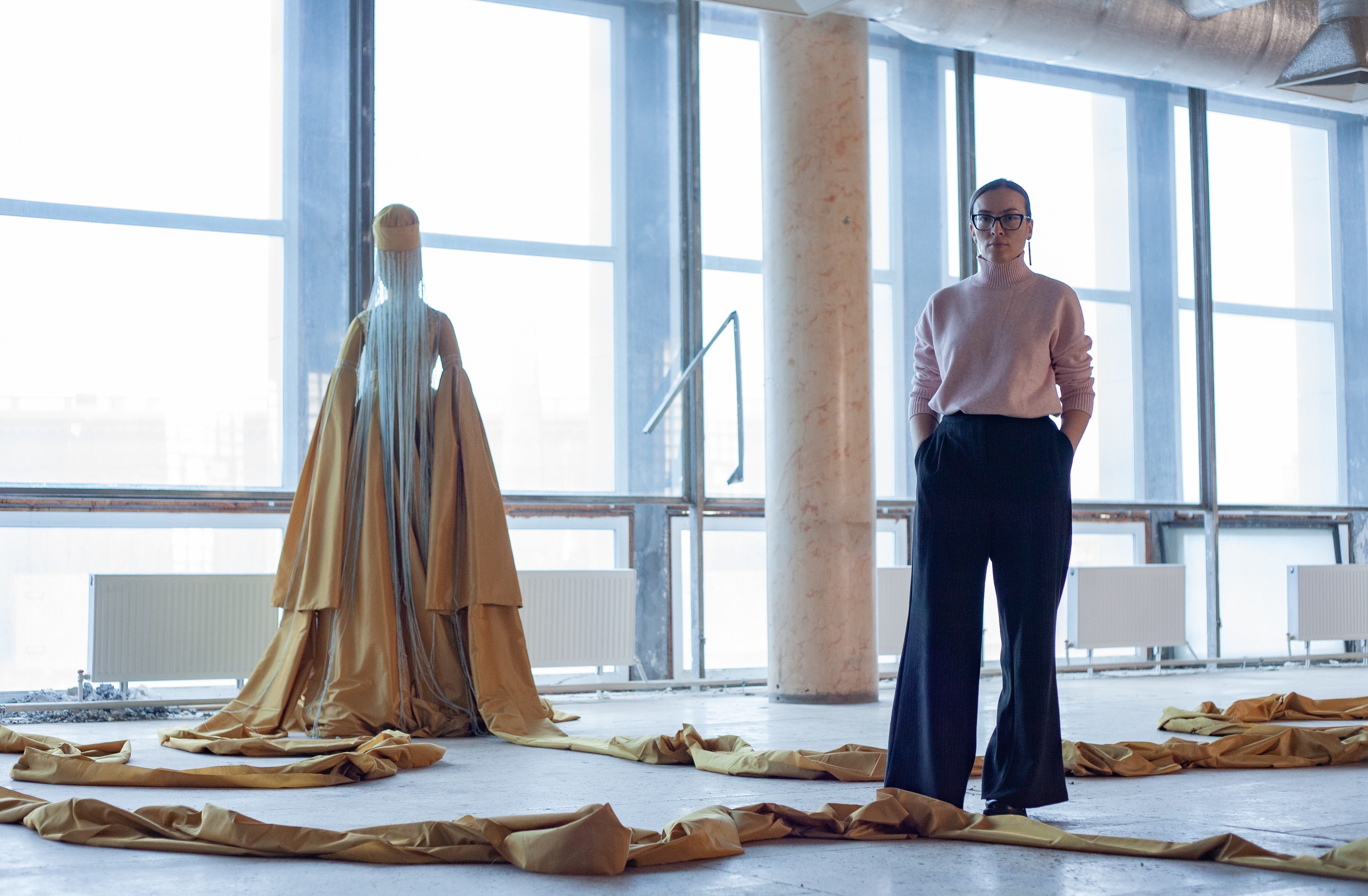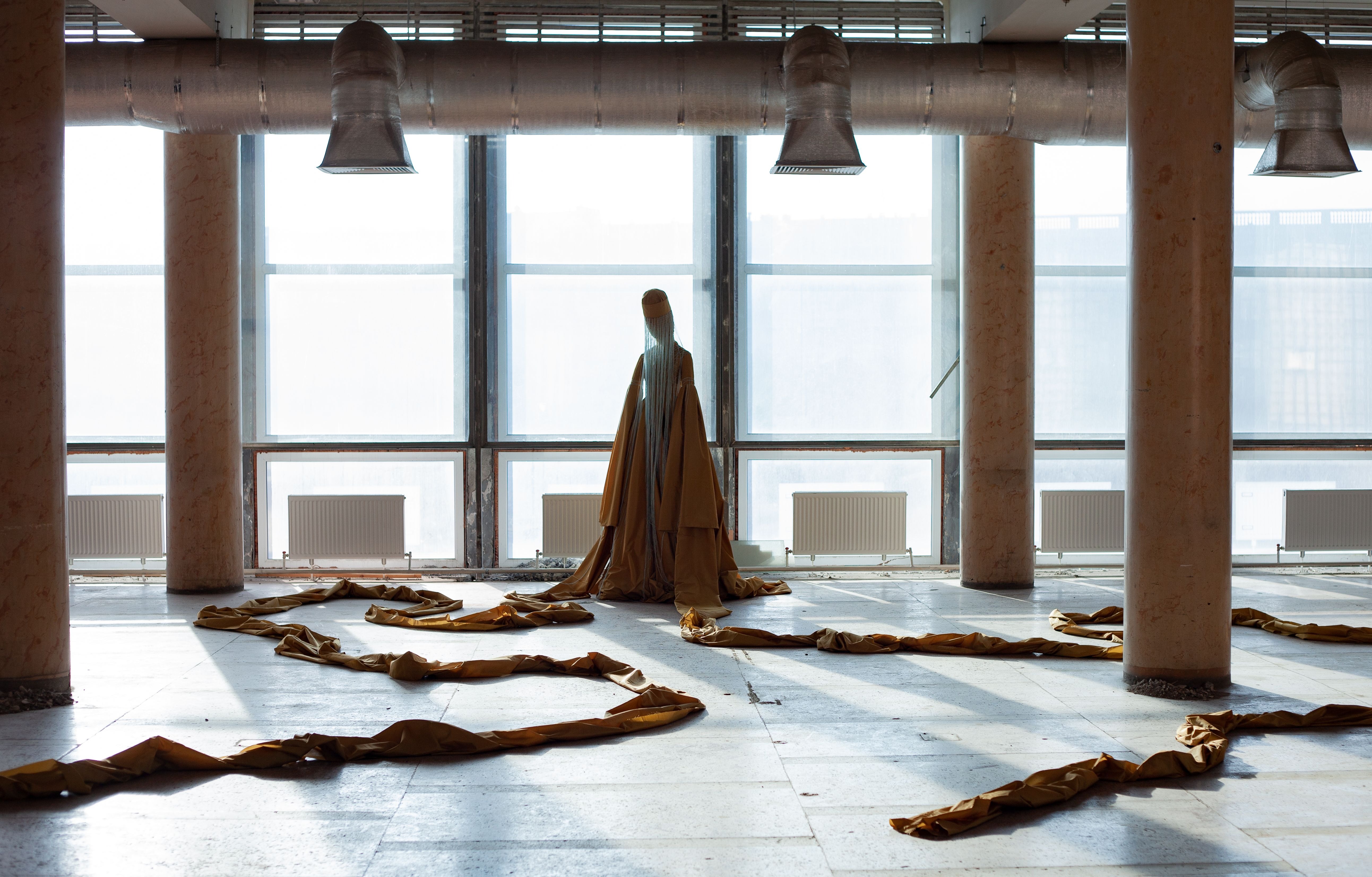 The artist uses her interpretation of traditional Adyghian art practices, as well as the iconography of Adyghian dolls, and by lengthening the sleeves of traditional Adyghian dress by many meters, creates a powerful sculpturesque image of crying as an eloquent testimony to the experience of survivors’ loss. The artist’s installation is both a commemorative object and a scenographic prototype to accompany the live performance of the musical heritage.