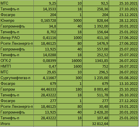 В январе пришли дивиденды от Россети-Ленэнерго, Газпромнефти и Татнефти. Вся табличка уже стала слишком большая. Всего за 3 года получили 48 выплат на сумму 32 812,64 руб.
