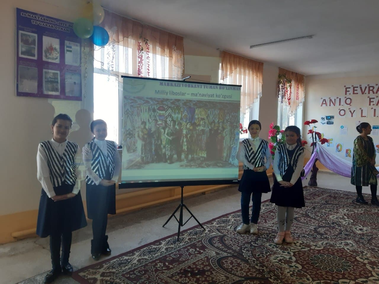 Vobkent tumani 20-maktabda o‘tkazilgan bugungi tadbirda milliy qadriyatlarimizga bo‘lgan hurmat, milliy urf-odat va an’analarimizga sadoqat, milliy liboslarning go‘zalligi va zamonaviy talqinini turli sahna ko‘rinishlari, jozibali raqslar va liboslar taqdimotlari orqali namoyish qildilar.