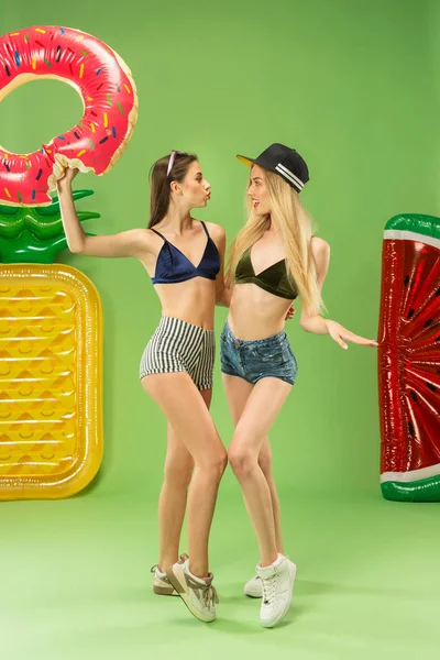 Милые девушки в купальниках позируют в студии . Летний портрет кавказские подростки на зеленом фоне . Летний портрет белых подростков на розовом фоне .