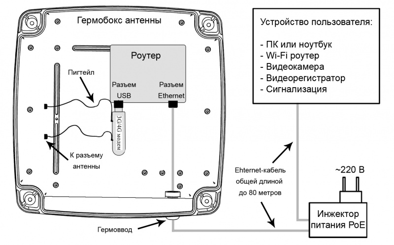 Широкополосная антенна позволяет не задумываться о географии установки, а роутер 4G позволит подключить к интернету все устройства, имеющие wifi-модуль: Iphone, Ipad, устройства на базе Android, ноутбуки, смарт-тв телевизоры и . . .