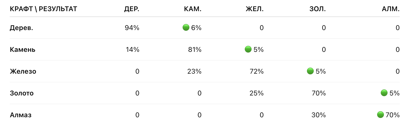 Как читать: строка — что крафтишь, столбец — что получаешь.