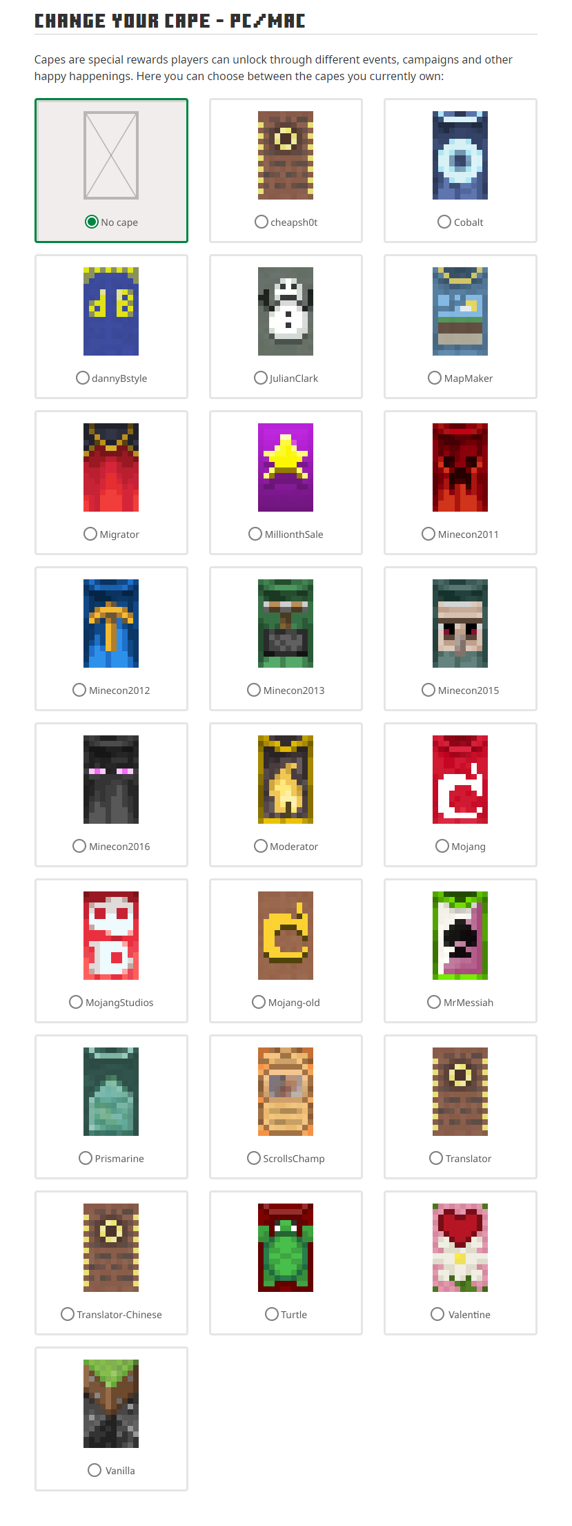 Minecraft Capes . Migrator ★271797 . MineCon 2016 ★7238 . MineCon 2015 ★6668 . MineCon 2013 ★6048 . MineCon 2012 ★3935 . MineCon 2011 ★3436 . Realms Mapmaker ★241 . Mojang ★185 . Translator ★101 . Mojira Moderator ★51 . Cobalt ★21 . Mojang Studios ★20 . Mojang (Classic) ★16 . Scrolls ★9 . Translator (Chinese) ★3 . Turtle ★2 . . .
